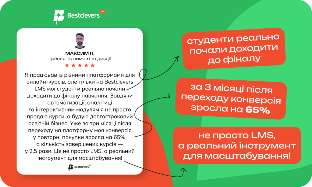 Bestclevers LMS – це не просто місце, де можна викладати курси. Це система, що робить навчання ефективним:
