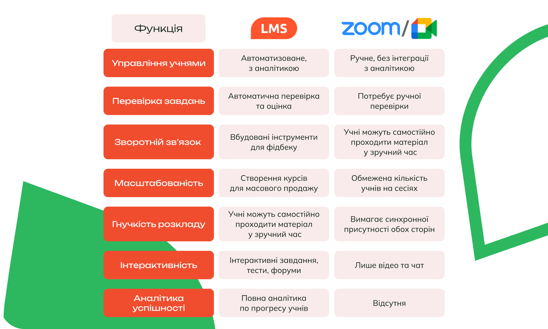 - Інтеграція: можливість легко поєднувати LMS з іншими інструментами, наприклад, календарями або платіжними системами.