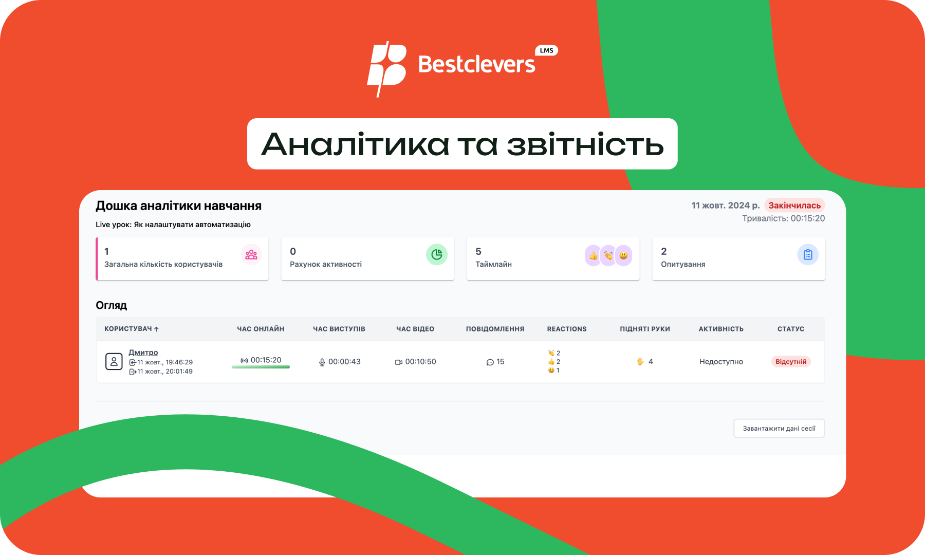 Інструменти аналітики BestcleversLMS дозволяють отримувати детальні звіти про успішність курсів, відвідуваність уроків, а також активність студентів. Наприклад, викладач може переглядати, скільки студентів успішно завершили курс, скільки часу вони витратили на навчання та які тестові завдання виявилися найскладнішими.