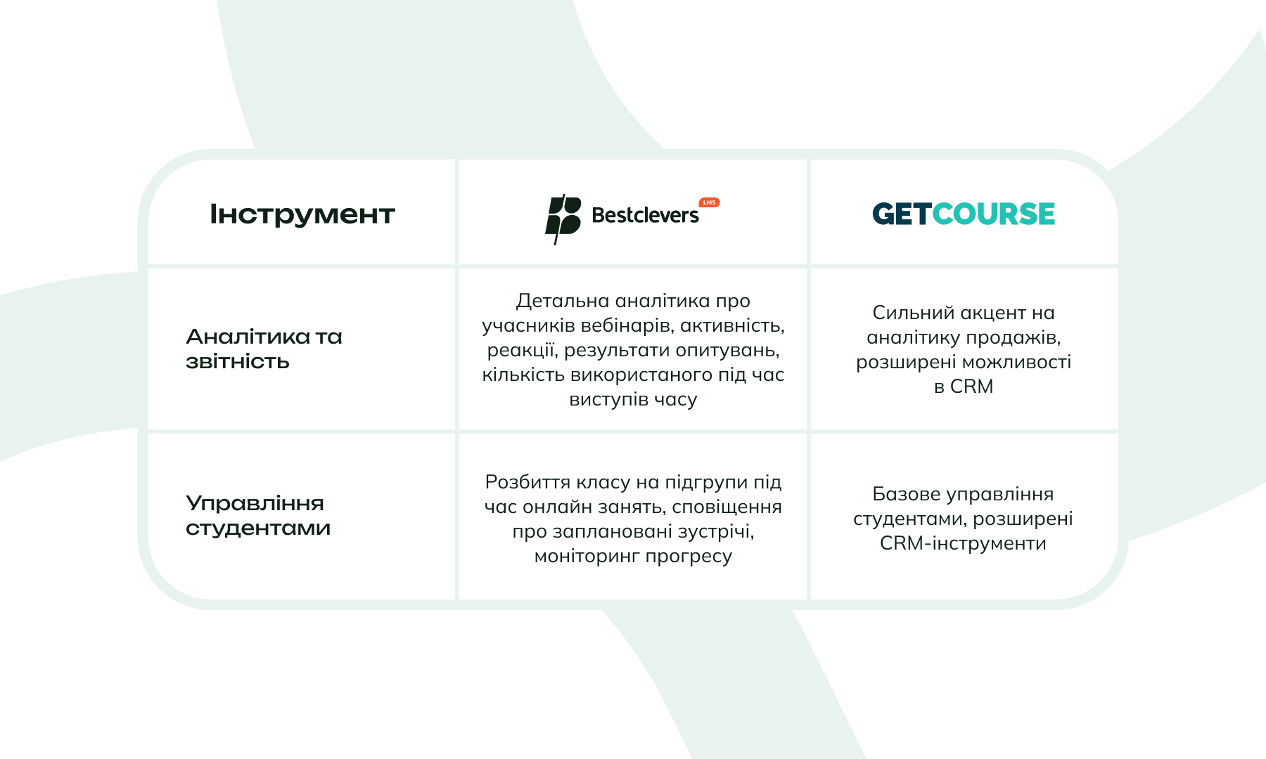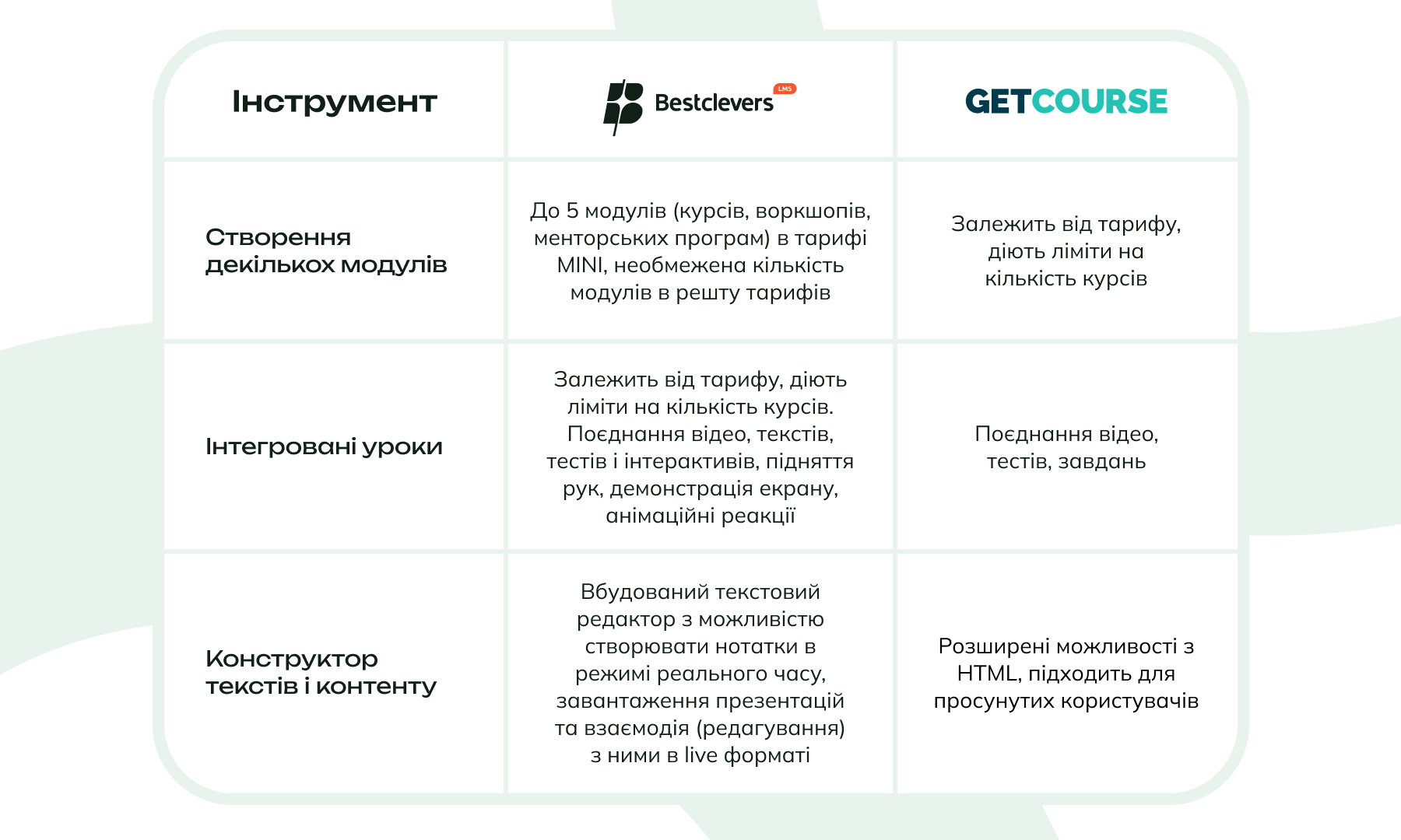 BestcleversLMS орієнтована на розвиток сучасної функціональної освітньої платформи з розширеними навчальними можливостями, тоді як GetCourse акцентована на інтеграції з CRM для продажу курсів.