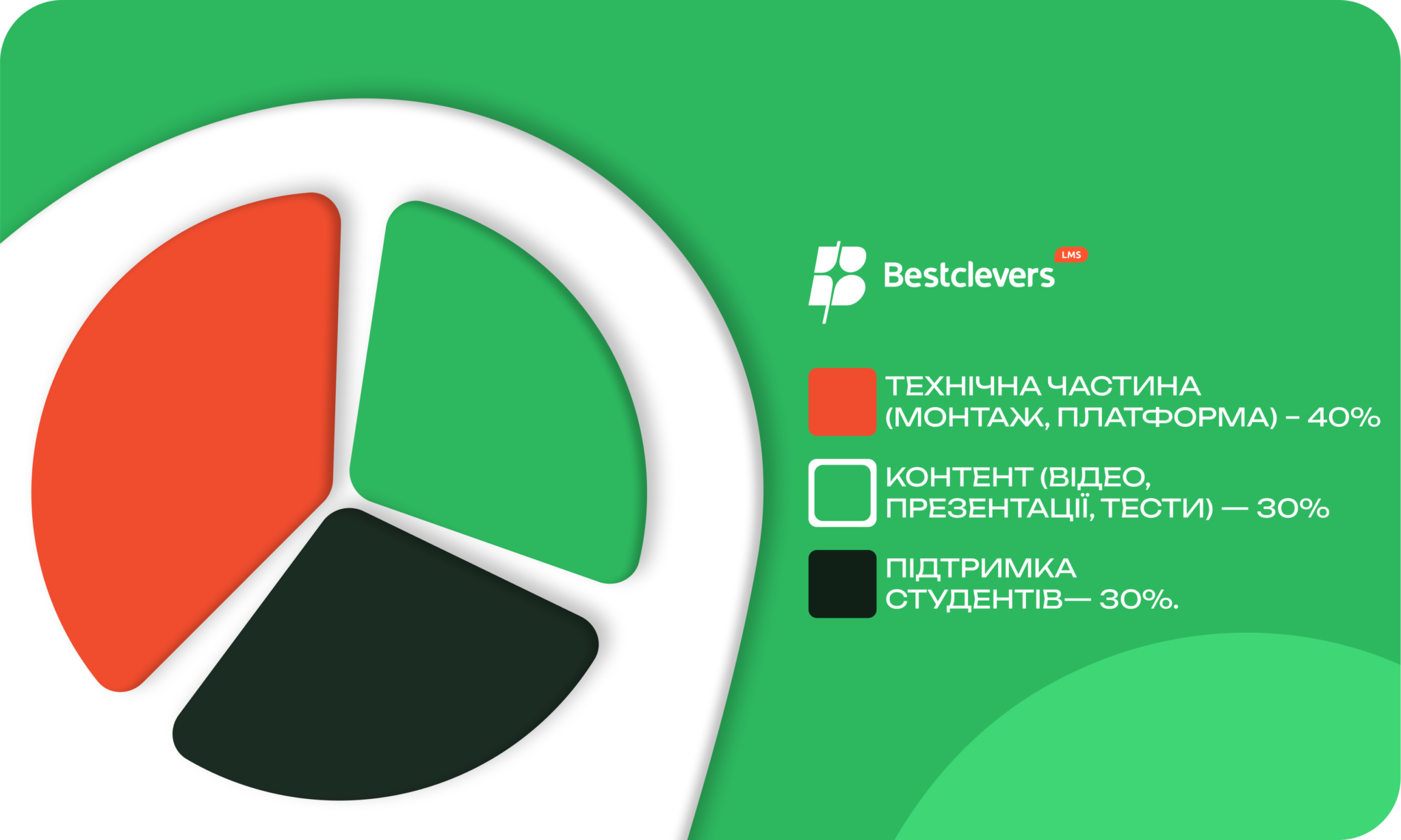 - Технічна частина – зйомка, монтаж, платформа для навчання. За все це треба або платити, або витрачати час.
