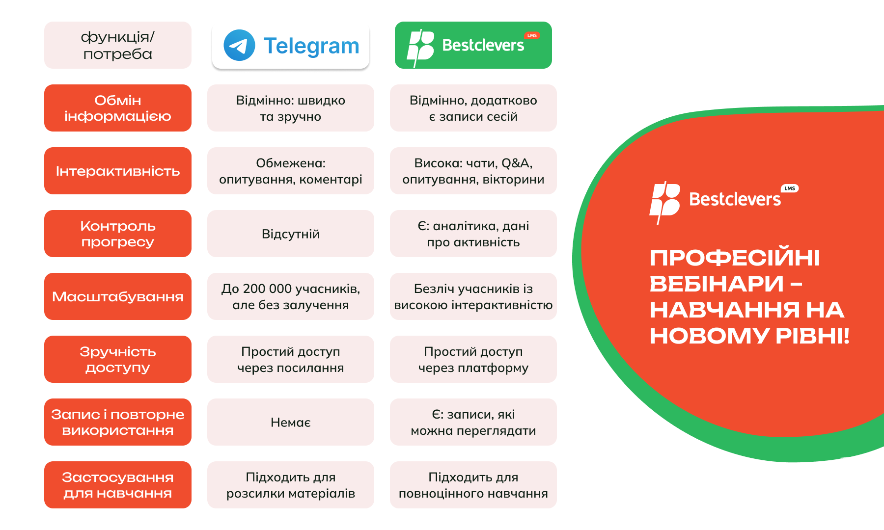 Уявіть, що ви можете запустити вебінар на 500 учасників, організувати Q&A-сесію, а потім надати запис тим, хто пропустив захід. Жодна закрита група в месенджері не зможе забезпечити такого рівня організації.