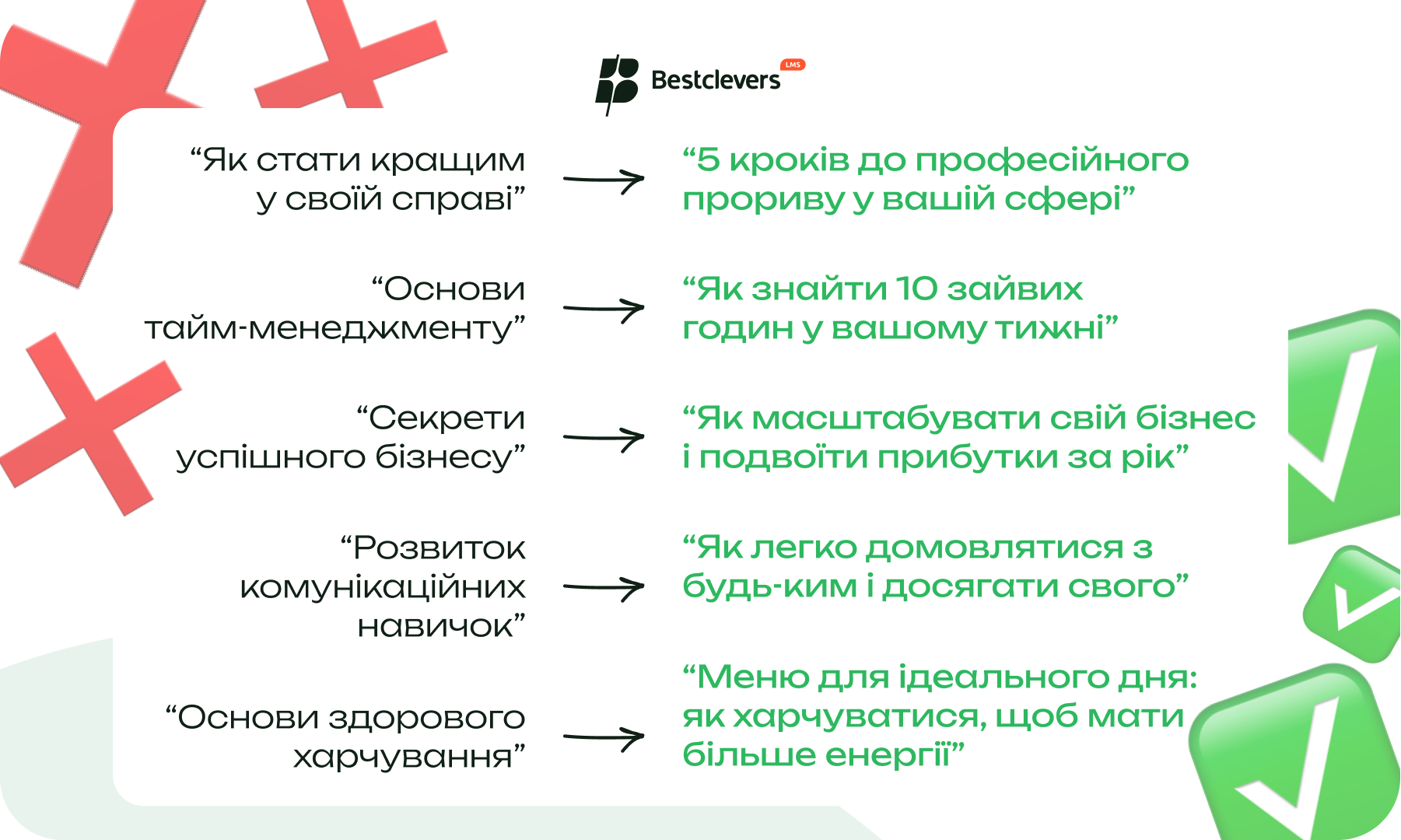 - Додайте практичності. Онлайн-навчання цінується за швидкий результат. Тема має обіцяти не просто знання, а готові рішення.