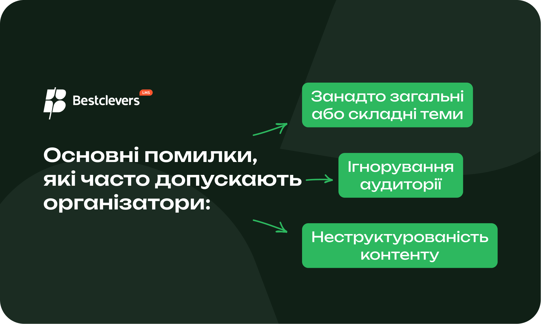 Навіть найкраща ідея для вебінару може провалитися, якщо підхід до вибору теми був неправильним. Перед запуском вебінару перевірте, чи вирішує тема реальні проблеми аудиторії. Адаптуйте формат під її очікування та забезпечте логічну структуру презентації.